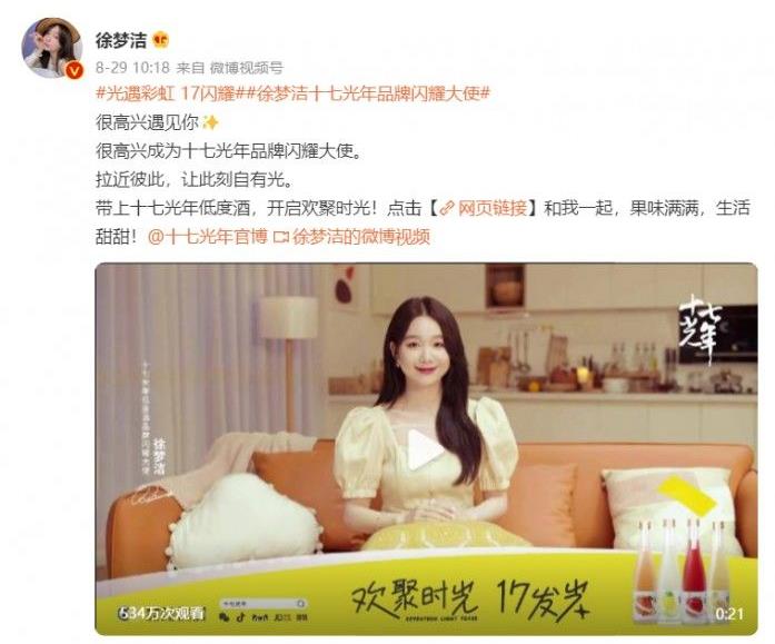 据十七光年官方数据显示,仅仅是官宣徐梦洁为“十七光年品牌闪耀大使”的信息,便取得了不错的成绩:全网累计曝光4000W+、视频播放量500W+、互动量20W+、官宣双话题阅读量均破千万,十七光年全电商销售环比增长600%。