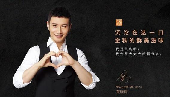 2018年,黄晓明担任蟹太太大闸蟹的形象代言人。三年以来,双方携手让蟹太太品牌的高端形象与品质标识逐渐深入人心,令蟹太太成为了家喻户晓的大闸蟹品牌。