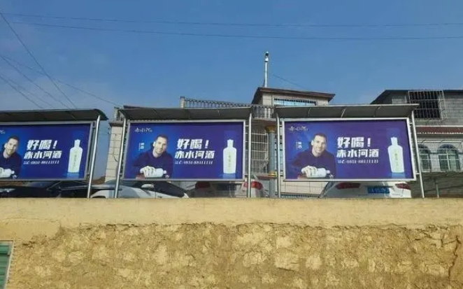 顺着项目工地一直走,来到一栋两层小楼前,如果没有门口挂着的牌子,很难将中赤酒业办公室与这栋小楼联系到一起。二层小楼门前坝子边上立着三块广告牌,前面张贴着梅西代言赤水河酒的广告,背面则是中赤酒业“万吨酱酒”的简介。